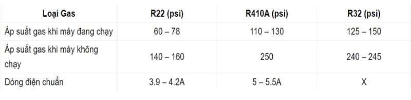 Dưới đây là bảng áp suất gas máy lạnh tham khảo được tính toán dựa trên dòng điều hòa có công suất hoạt động 1 HP/9000BTU. Các chỉ số áp suất trong bảng này có thể thay đổi khi nguồn điện, độ dài đường ống dẫn gas khác nhau. Nếu chỉ số thấp hơn khoảng cách trong PSI thì chứng tỏ máy điều hòa đang thiếu gas, vượt mức chỉ số trên thì điều hòa thừa gas.